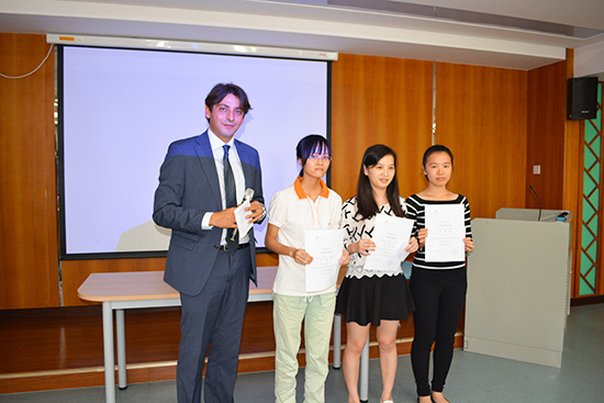 本网讯 10月21日下午,第十五届意大利语言文化周系列活动之专业讲座暨斯特雷佳文学奖入围作品笔译比赛颁奖仪式在我校MBA教育中心306教室隆重举行。出席本次会议的有意大利驻广州总领馆领事白思诺(Massimo Baldassarre)先生,意大利驻广州总领馆文化处负责人施丽萍女士,外教Matteo Brandi老师以及百家乐试玩平台