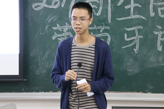 比赛开始,参赛选手们按学号顺序依次上台进行个人展示,台下的评委们在认真倾听的同时在纸上做记录,以便稍后给选手们提出针对性意见建议。在自我介绍环节中,葡语小将们毫不怯场,从容淡定地向大家介绍了自己的个人信息、兴趣爱好等内容,时不时出现的“肢体语言”引得台下一片欢声笑语。到了朗读文章环节,面对陌生的语段,选手们毫不惊慌,并沉着冷静地以自己标准的语音、和缓的语调将文章读得生动清朗。其中,11号选手张靖莹和26号选手陈隆的表现尤为突出,获得了台下三位评委的赞许。