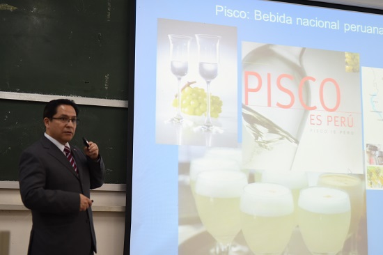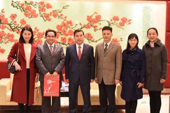 副院长杨晓敏老师以及秘鲁驻广州总领事馆工作人员。会议上,焦方太先生首先对David先生的到访表示热烈欢迎。随后他谈到了我校与秘鲁当地高校间的积极合作,希望在秘方的协作下,我校的西班牙语专业能得到长足发展,有所突破。对此,David先生回应道,他认为如今越来越多的秘鲁人有兴趣学习中文,中秘两国关系紧密,中华文化在秘鲁影响深远。他对于焦副校长提出的加强联系合作表示了认同。同时他也指出,中秘两国间除了互派留学生以外还能够有更多合作推进。焦副校长对David先生的提议表示了充分认可,并鼓励两国学者共同合作开展研究项目。会议最后,双方合照并且交换了礼物,我校将《论语》赠与总领事,而David先生则赠送著名秘鲁作家VargasLlosa的作品给我校。会议结束后,焦副校长与David先生在两国国旗下亲密合影。随即David先生前往二教116教室向我校西班牙语专业学生们开展《秘鲁文化之旅》专题讲座,讲述秘鲁的灿烂文化。