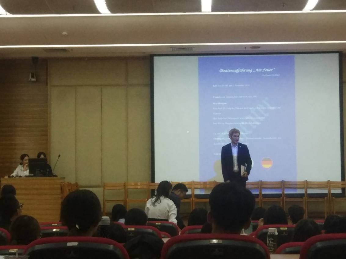 教师一职的Diez先生受邀与德语系二、三年级的同学开展了为期十天的戏剧工作坊活动,并于2018年11月1日下午在图书馆负一层报告厅进行了汇报演出。