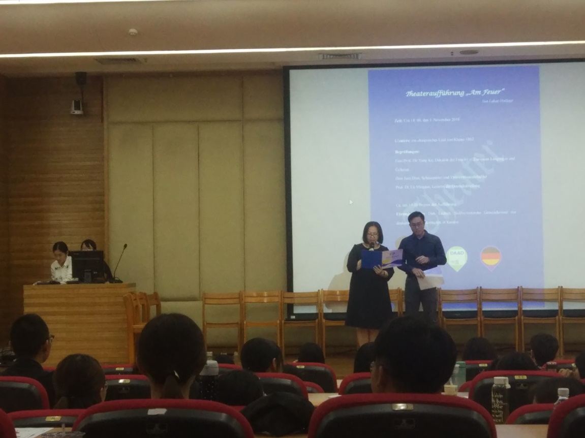 院长杨可教授为本次活动致辞,对前来参与本次活动的各位领导来宾以及老师同学们表示了诚挚的欢迎。德语系系主任卢铭君教授则为我们介绍了本次戏剧《在火旁》(Am Feuer)的作者Lukas Holliger并朗读了作者为本次活动特意撰写的致辞,使得观众对剧本的内容与主旨有了进一步的了解。