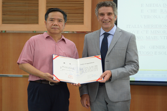 院长郑立华郑重地将客座教授聘任证书授予来自意大利马切拉塔大学的博士后教授Angelo Ventrone 。