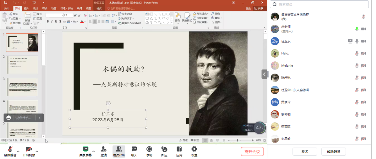 在线上开展了德语系实践周学术讲座,北京外国语大学任卫东教授应邀开展了一场题为《木偶的救赎---克莱斯特对意识的怀疑》的学术讲座。讲座由百家乐在线试玩