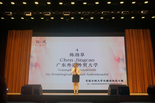 开幕致辞后,比赛正式拉开序幕。第一个环节为命题演讲,主题分别为“全球化背景下德语学生的文化使命”(Kulturberufung der Germanistikstudierenden in der Globalisierung)、“人类和科技进步”(Menschheit und technischer Fortschritt)、“互联网+时代里的多语言+”(Multisprachplus im Zeitalter Internetplus)以及“自我实现和责任意识”(Selbstverwirklichung und Verantwortungsbewusstsein)。我校陈劲草同学为本场比赛第一位上台的选手,她的演讲主题是“互联网+时代里的多语言+”,通过分析和举例她提出:“当今时代人工智能潜力巨大,语言学习者应实现更加全面的发展”。