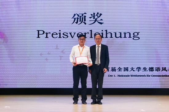 紧张激烈的比赛随着抢答题的结束走向尾声,第一届全国德语风采大赛在颁奖典礼的音乐中落下帷幕。最终,我校获得团体三等奖。此外,张均同学凭借其优异的语言水平和反应能力在配音环节脱颖而出,获得“配音之星”称号。