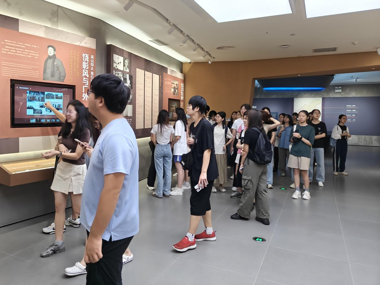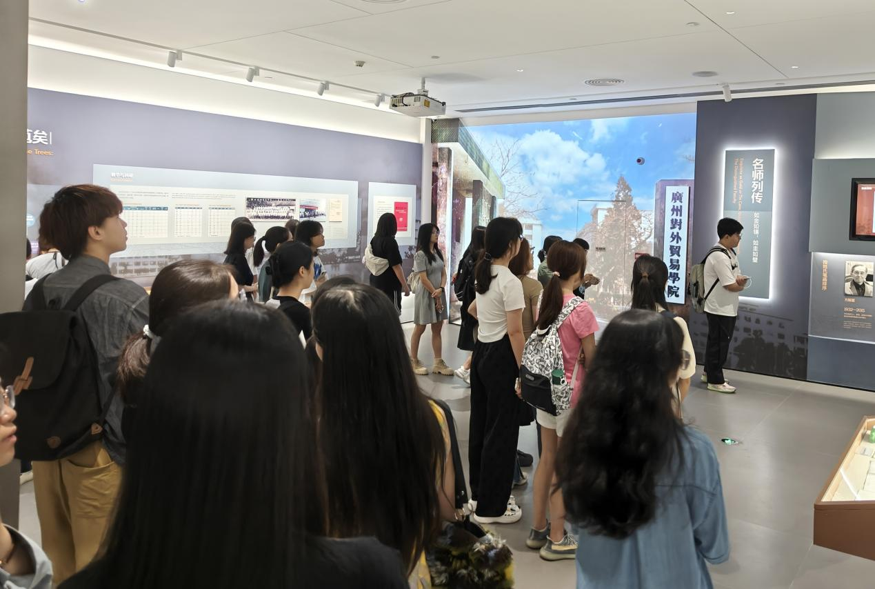 进一步深入馆内,讲解员为我们介绍了我校的办学背景:广东外语外贸大学为全国国际经济与贸易学科的创始单位之一,在近代的发展、壮大中,已具有了鲜明的国际化特色,在华南地区国际化人才培养和外国语言文学、全球经济治理、中华文化国际传播的重要教育基地中独树一帜。它诞生于社会主义革命与建设、探索时期,发扬了奋发图强、“百花齐放,百家争鸣”、“长期共存、互相监督”之精神,蕴涵了敢为人先、艰苦奋斗的爱国主义之情怀。在新中国百废待兴、急需国际化人才的环境中为祖国濡沫涸辙,是新时代楚璧隋珍、无双国士的重要培养基地。广外的钟声发出“明德尚行 学贯中西”的信号,激励了一代又一代广外人义无反顾地、心怀道义地走上了为祖国开拓新建设环境的道路。