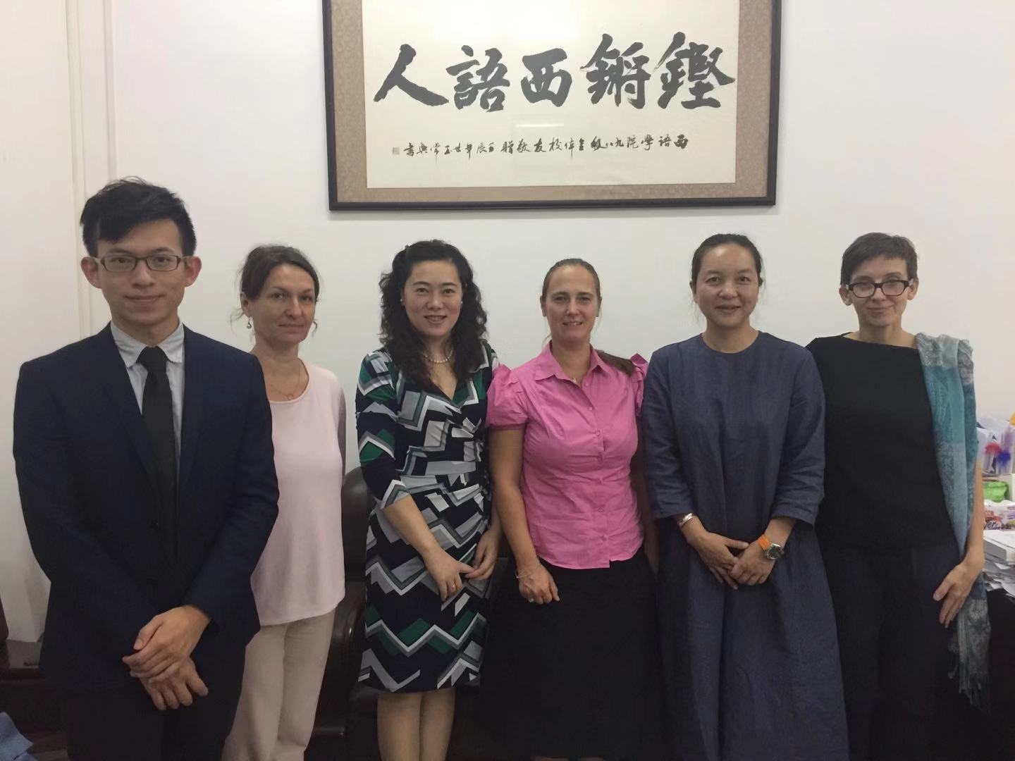 本网讯 10月25日,波兰国家高等教育交流委员会(Narodowa Agencja Wymiany Akademickiej 以下简称NAWA)代表团来粤参加国际教育展,期间与波兰语系系主任茅银辉教授、外教宝琳娜•海赫瓦奇(Paulina Chechłacz)、莱娜塔•锡根(Renata Siegień)进行了亲切会面,出席会面的还有波兰驻广州领事馆总领事约安娜•斯科柴克(Joanna Skoczek)女士。会面期间系主任茅银辉教授向代表团介绍了我系的建立与发展概况,就我系在外教派遣、学生奖学金项目及高校合作等方面与代表团进行了深入交流。
