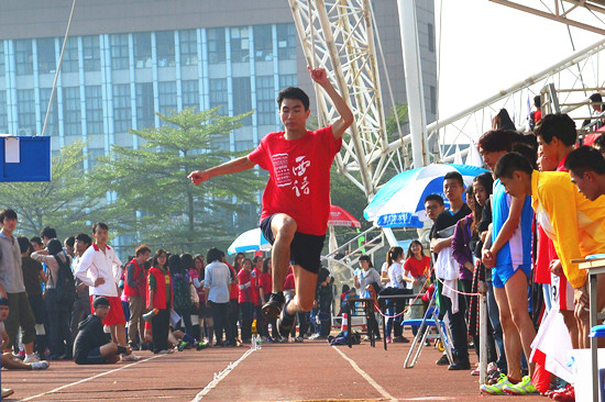 本网讯 11月14日上午,2014年广东外语外贸大学校运会热烈召开。现场气氛热烈,而天空也一扫阴云,阳光灿烂。随着精彩的开幕式结束,校运会的比赛项目如火如荼地展开了。