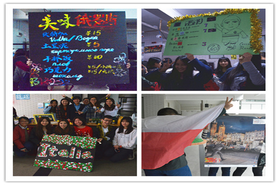 各语系摊位均有同学们精心制作的食物饮料,以供参加开幕式的来宾朋友们享用。各语系所代表的国家文化风情不同,其食物特色也各式各样,如法语系的红酒冻,德语系的啤酒香肠,葡萄牙语系的特色蔬菜汤,俄语系的伏特加等。诱人的菜肴,以及同学们卖力的宣传,使整个欧罗巴开幕式现场气氛走向了白热化。