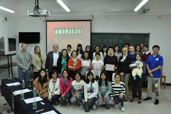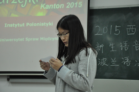 11月27日晚6点30分,2015级波兰语系新生语音语调大赛于六教205举行。本次大赛受到了波兰语系的高度重视,邀请了多位重量级评委,包括波兰驻广州总领事约安娜•斯科柴克(Joanna Skoczek)女士、波兰驻广州领事馆文化部的工作人员马箫剑(WojtekKarmasz)、雅盖隆大学对外波兰语教学中心的主任彼得·豪尔巴托夫斯基(Piotr Horbatowski)教授、波兰语系系主任茅银辉老师和我校的波兰留学生克里斯蒂娜•米克什科(Krysiatyna Mikśko)。外教阿格涅什卡•雅辛斯卡(AgnieszkaJasińska)老师和大二学生张慧玲作为主持,有序地组织了比赛。