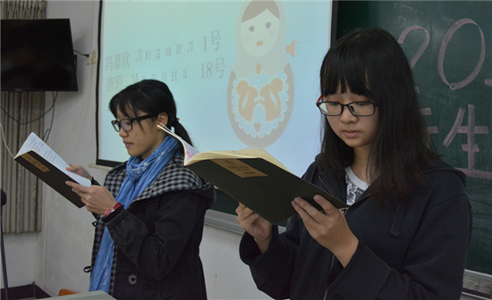 11月27日,俄语系新生语音语调大赛在北六教B204正式举行。本次大赛旨在检测俄语系新生的语音和语调水平,是对同学们两个月以来学习成果的检验。出席本次大赛的评委有莫斯科大学教授СветланаГригорьевна Тер-Минасова、俄语系黄时勋副教授和俄语系外教Джалиль。本次决赛分朗诵课文和才艺展示两轮进行,评委根据选手的语音、语调、流畅度和感情这四个方面对24位选手进行打分评定,最后根据总分排名决出名次。