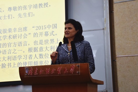 接下来由意大利驻广州总领事艾古丽女士致辞。首先,她通过各类数据表明意大利语的传播工作在全世界取得了丰硕的成果,随后提到意大利语在中国的传播也非常广泛,在习近平主席提出的“一带一路”构想的大背景下,意中将进一步加强及拓宽双方在各领域的合作与交流。最后,她还对全体意大利语教师在意大利语教学及文化传播方面做出的贡献表示了感谢。