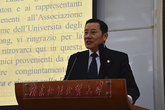 本网讯 2015年12月11日上午9点,2015中国意大利语教学与研究学术研讨会开幕式在广东外语外贸大学第六教学楼B103会议室举行。出席开幕式的领导和来宾有:意大利驻广州总领馆总领事艾古丽女士、广东外语外贸大学副校长方凡泉教授、中国意大利语教学研究会会长张宇靖教授、百家乐在线试玩