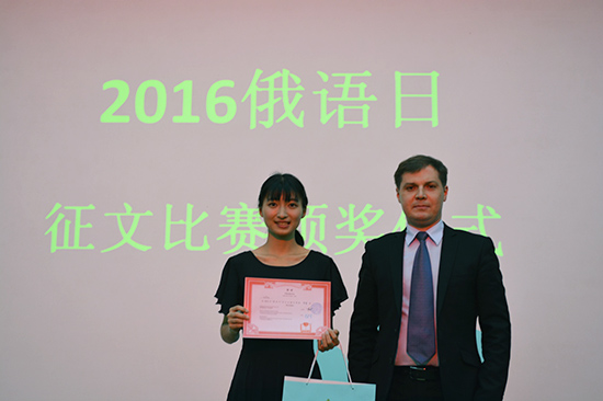 俄语系教师陈欢宣读本届“俄语日”书画比赛和征文比赛获奖名单,现场嘉宾分别上台为获奖学生颁发荣誉奖状并赠送本届“俄语日”纪念礼品。