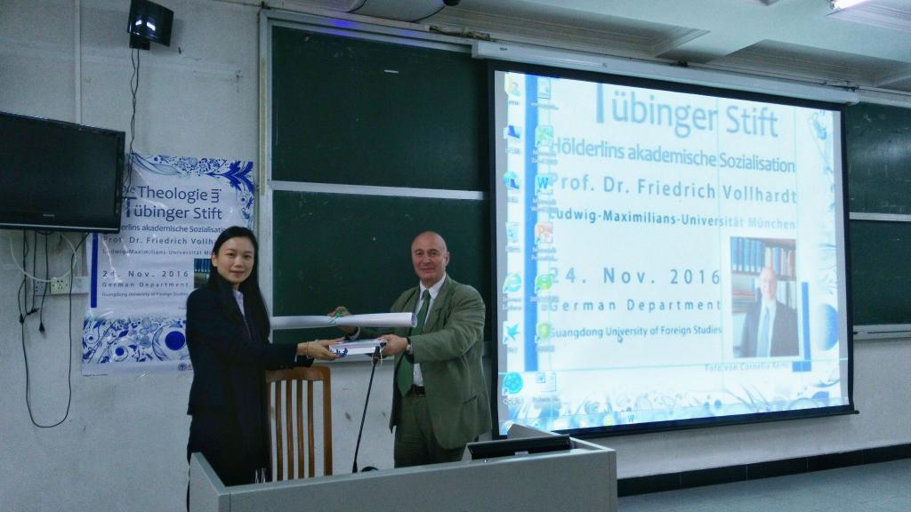 师生代表对教授的到来表示热烈的欢迎,卢铭君老师代表德语系送上礼物。