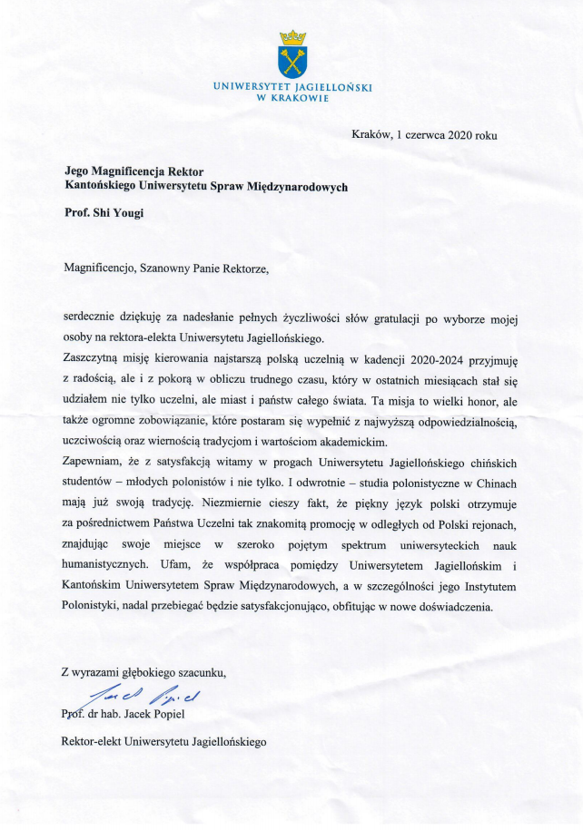 石佑启校长代表我校向波兰雅盖隆大学新任校长亚切克·珀皮耶勒(Jacek Popiel)表示衷心祝贺,指出雅盖隆大学是波兰历史底蕴最悠久的高校,是优秀的学术中心,培养了众多卓越人才。领导雅大,既是荣誉,也是重任。石佑启校长还在信中感谢雅大为我校波兰语系学生提供宝贵学术平台,衷心希望两校能保持自广外波兰语系建立以来的全方位、多层面合作。在信末石佑启校长表达了对波方疫情的关怀与祝愿。