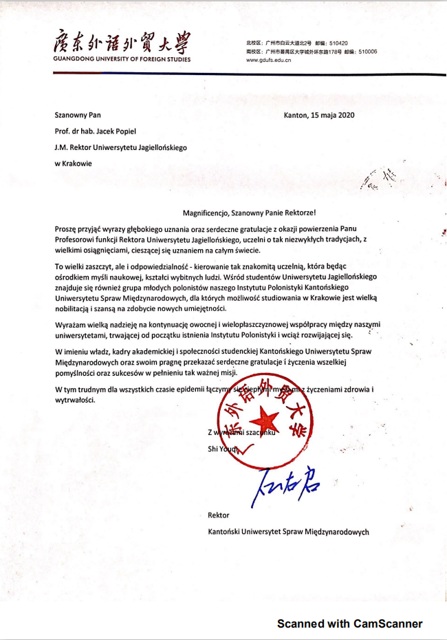 亚切克·珀皮耶勒校长回函感谢我校诚挚祝贺,并表示他将继续发扬雅大深厚的学术传统与价值,肩负起管理大学的光荣使命。雅大校长在信中赞扬广外在中国推广与发展波兰语学术研究所做出的努力,肯定了两校多年合作成果,热情欢迎广外学生前往雅盖隆大学进行学习与交流。