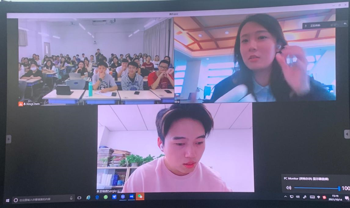 之后,张主任连线了在新华社工作的两位师兄师姐,师兄师姐们给我们分享了十分宝贵的新华社工作经历和心得,并勉励我们努力学好语言,扩充知识面。