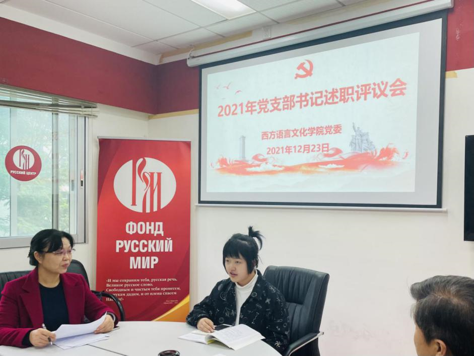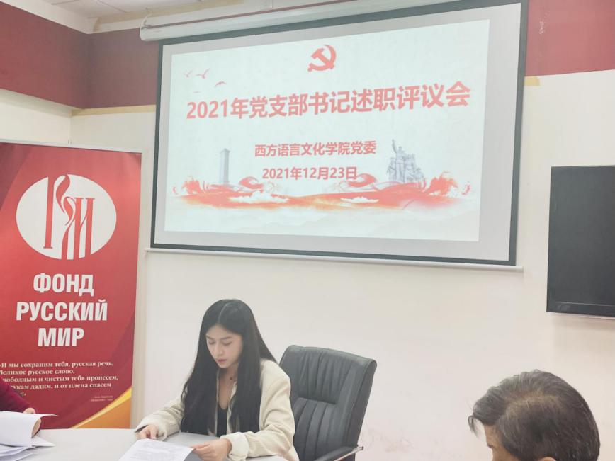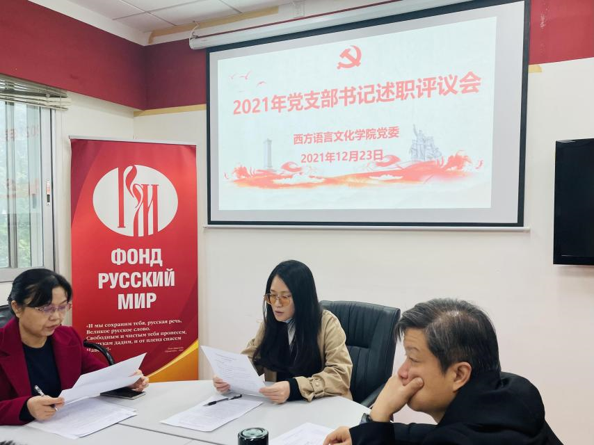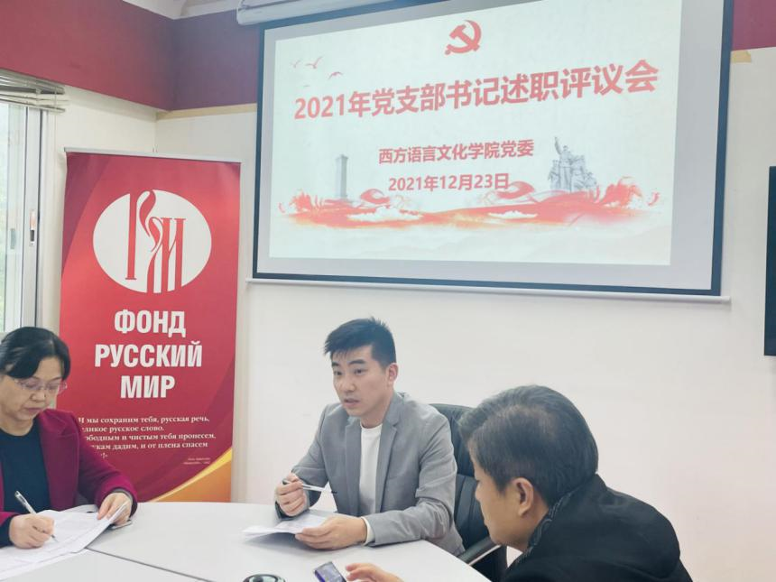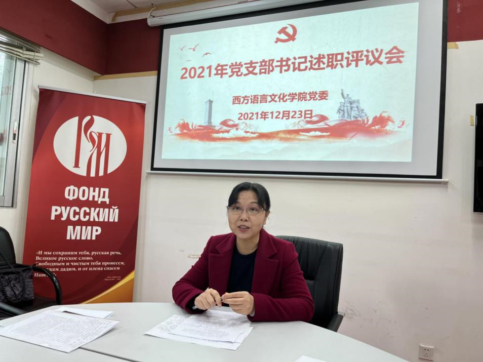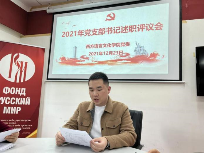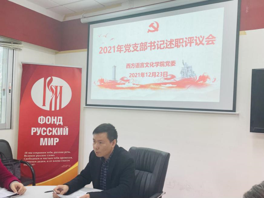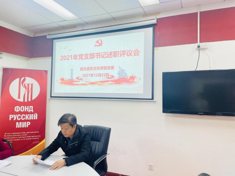 党委书记敖湘晖主持。各党支部按照教工第一党支部、教工第二党支部、教工第三党支部、法语本科学生党支部、德语本科学生党支部、西语本科学生党支部、俄语本科学生党支部、非通用语本科学生党支部、法俄研究生联合党支部、德西研究生联合党支部的顺序依次进行述职。