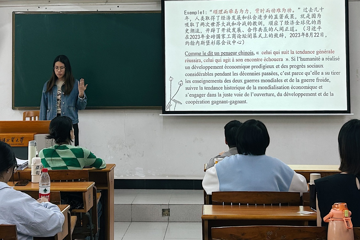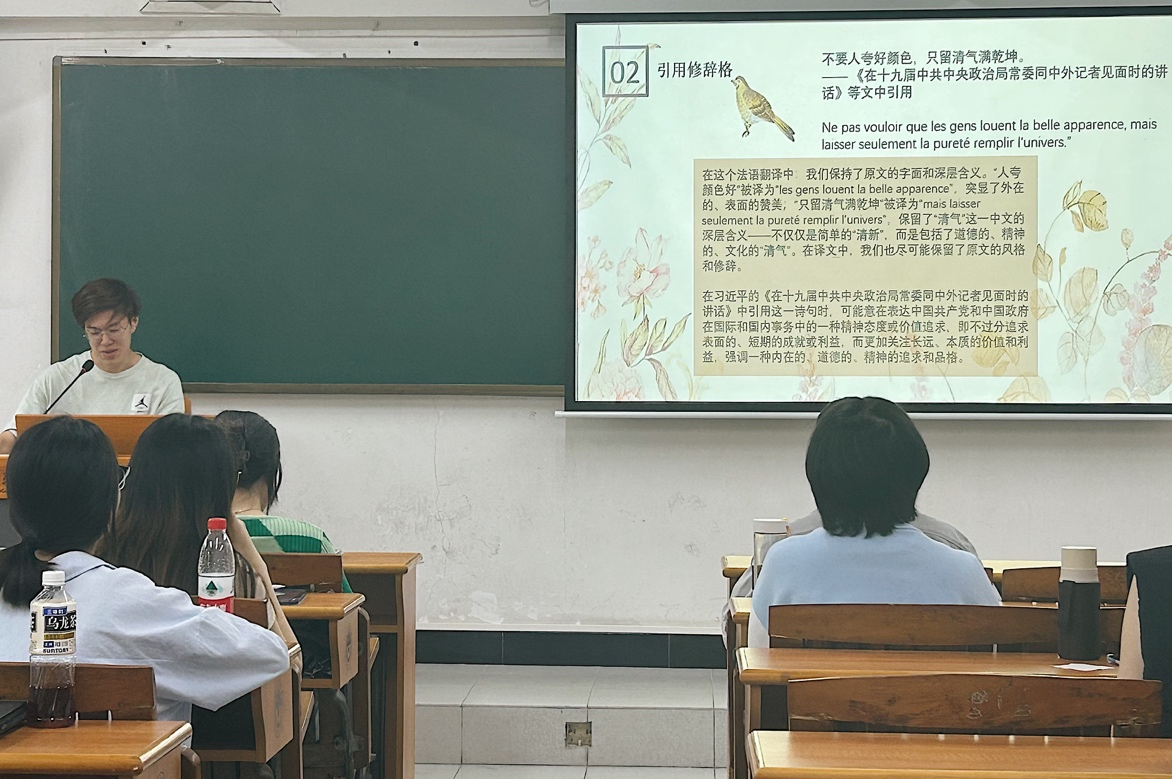 在安排小组展示前,陈老师再次强调了引用修辞格的定义、分类、重要性及翻译时的注意事项,并结合实例辨析了汉语和法语两门语言中修辞格的不同特点。随后,学生结合所学知识并借助PPT等形式分组展示了作业内容,分析了时政文段所引用的古文、诗歌、典故的作者、出处、意义,并讲解了法语译文中引用修辞格的翻译策略和技巧。展示过程中师生互相提问,共同梳理重难点,课堂气氛活跃。