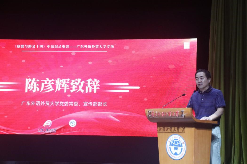 本网讯 6月28日下午,由广东外语外贸大学及广州广播电视台共同主办,广州广电传媒集团有限公司、广州互动传媒有限公司协办的中法合拍纪录电影《康熙与路易十四》广东外语外贸大学专场在我校白云山校区第六教学楼报告厅顺利展映。广州市广播电视台台长陈家成、副台长杨露,广州市广播电视台影视频道总监、电影《康熙与路易十四》制片人徐斌,广东外语外贸大学校长闫相斌,宣传部部长陈彦辉,学生工作部部长国佳,学生就业指导中心主任康为茂及我校师生出席本次活动,活动由百家乐在线试玩