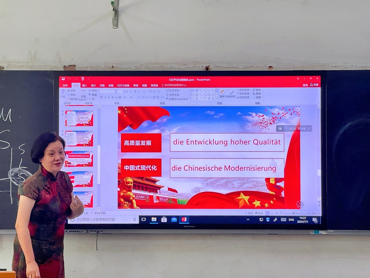 滕奕丹老师首先向同学们讲解了《习近平谈治国理政》德语版1-3卷出版发行的基本信息以及重要意义,再带领同学们从德语版目录入手领略各卷中重要的主题及概念、理念的中、德语表达方式,还就部分高频词进行了学习以及归纳总结。老师强调,这本书对于了解中国的政治和经济发展有着重要意义,并提到大三的时候会有专门的课程,帮助同学们具体学习《理解当代中国》的阅读和写作。